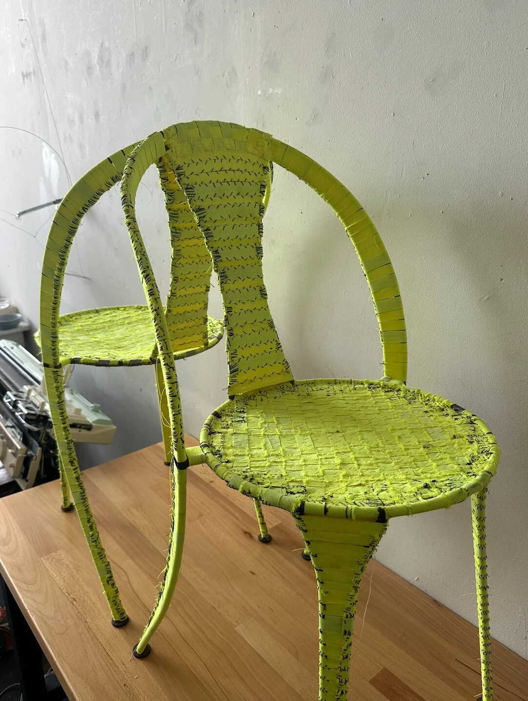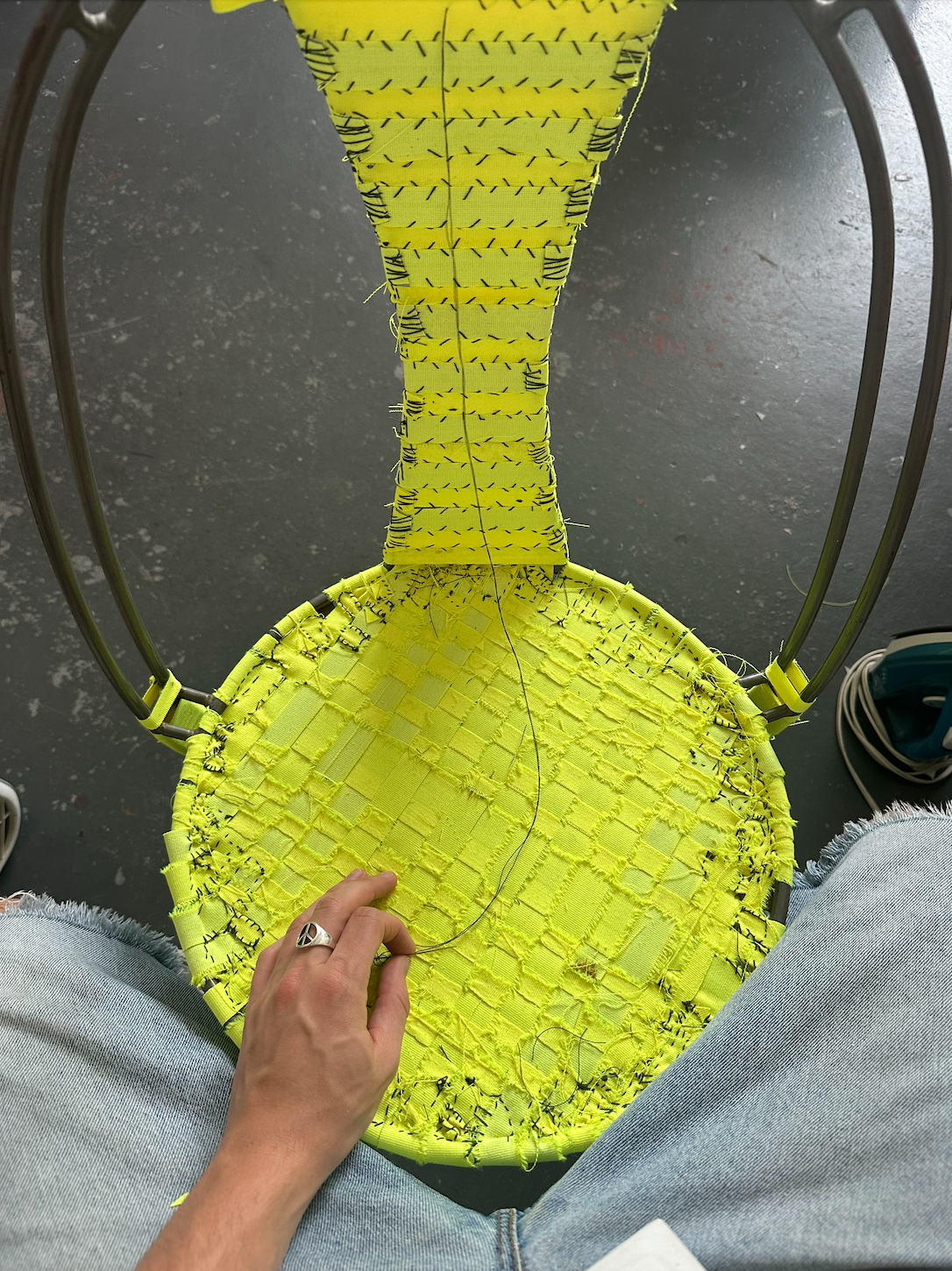 Strips of safety-tape woven and hand-sewn with cotton thread, beeswax, and metal mesh